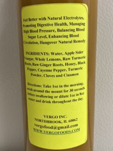 INGRIDIENTS: Water, Apple Cider Vinegar, Whole Lemons, Raw Turmeric Roots, Raw Ginger Roots, Honey, Black Pepper, Cayenne Pepper, Turmeric Powder, Cloves and Cinamon